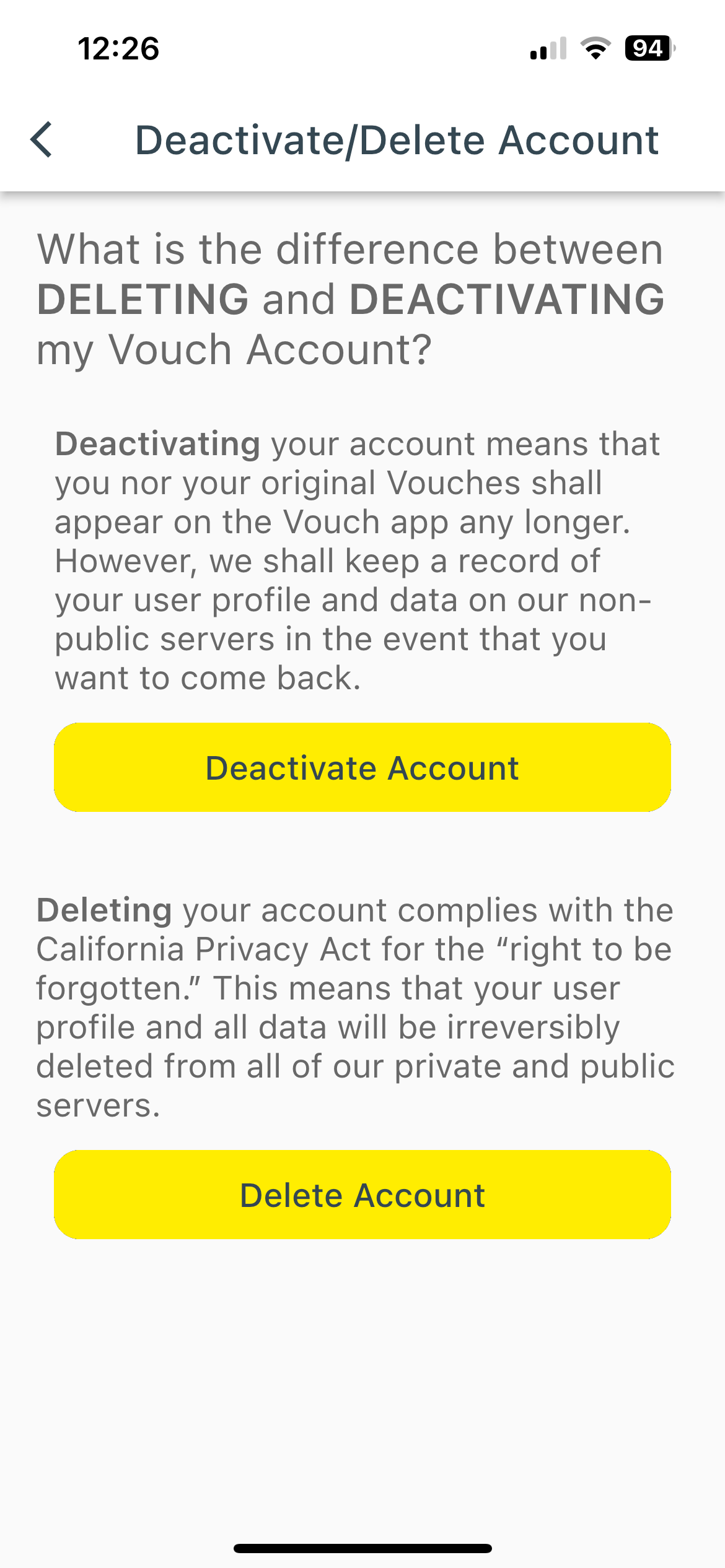 Hi there! We are VOUCH Vault. If you’ve landed here than you’re probably looking for instructions on how to delete your account…you’ve come to the right place although we’re sorry to see you go!